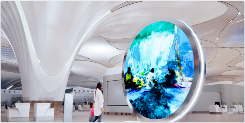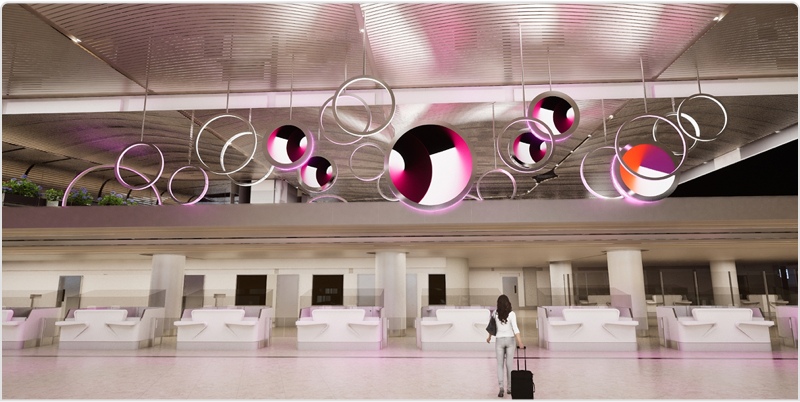 Know MoreAntar Yatra transforms the check-in area into an interactive journey. Two 4.5 m double-sided circular LED display stands as portals, responding to passenger movement—mirrors ripple, colors shift, and visuals evolve as you walk. The artworks respond to the presence of the passengers, their movement sparking vivid transformations that embody the essence of transition—of before and now, of heritage and innovation—drawing passengers quite literally into the Navi Gate, where every step forward is a crossing through time